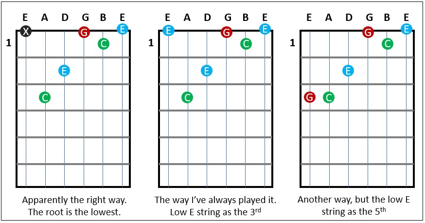 Including or excluding the low E didn’t make a discernable difference to my still musically immature ears because it’s the 3rd of C – part of what comprises the C major chord!
