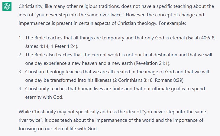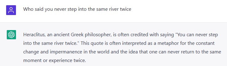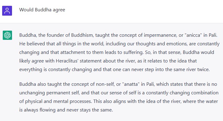 In a later conversation, I did ask ChatGPT which philosophers would agree with “you never step into the same river twice”. It again mentioned that it’s often attributed to Heraclitus but listed (along with brief reasonings) Buddha, Lao Tzu, Stoics, Heraclitus, Jainism, Hinduism.