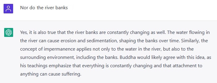 For one, it did keep track of our conversation. That ability is a big part of the secret sauce to ChatGPT. My question wasn’t a leading one either. for example, “Are the river banks part of the metaphor of impermanence as well?”