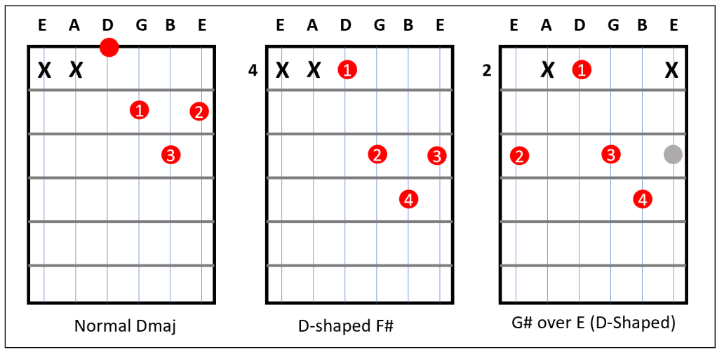 My latest “How did I not know about this?” moment is discovering the “D-shaped bar chords”. A couple of weeks ago, I randomly picked two new songs to learn that sport these chords: BTO’s “Let it Ride” and Rush’s “Spirit of the Radio”. The left of Figure 1 shows the very simple Dmaj chord. Three fingers, no pinky needed, spans only two frets, and the fingers are clustered nice and close but not too tight.