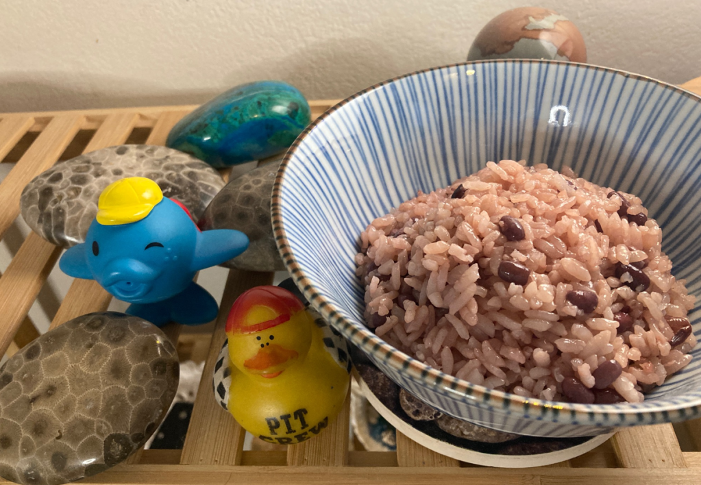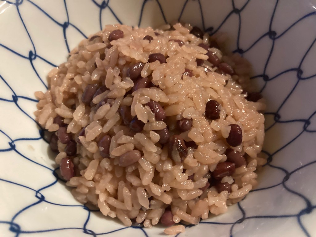 The rice and beans is called sekihan—literally red rice—traditionally made with azuki beans. The rice is tinted by the bean cooking liquid rather than seasoned, and the flavor is intentionally restrained.